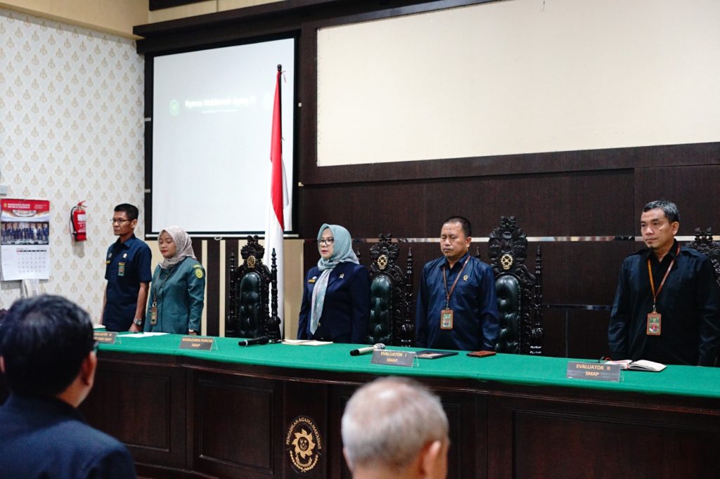 Kedatangan Tim Penilai SMAP(Sistem Manajemen Anti Penyuapan) Badan Pengawas Mahkamah Agung RI diterima langsung oleh Ketua Pengadilan Agama Makassar Dr. Hasnaya H. Abd. Rasyid, M.H dan Wakil Ketua Muhammad Surur S.Ag selaku Ketua Tim SMAP Pengadian Agama Makassar beserta seluruh jajaran Keluarga Besar Pengadilan Agama Makassar. Dalam Opening Meeting, Ketua Pengadilan Agama Makassar, Dr. Hasnaya H. Abd Rasyid, M.H., menyampaikan selamat datang kepada Tim SMAP Bawas Mahkamah Agung RI, yang akan melakukan pemeriksaan dan penilaian langsung terhadap Pengadilan Agama Makassar dan mengharapkan mendapatkan hasil terbaik untuk mendapatkan Sertifikat SMAP Paripurna.